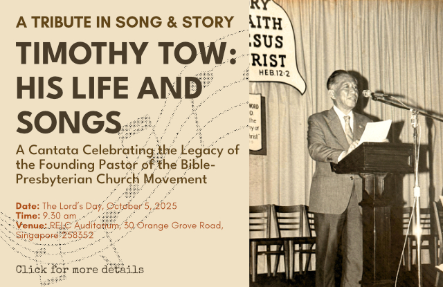The cantata on the life and songs of our beloved founding pastor—the Rev Dr Timothy Tow—is presented in obedience to the Fifth Commandment, as we remember God’s providence in his life and how he was called and used by God to found the Bible-Presbyterian Church movement in South-East Asia and the Far Eastern Bible College “for the word of God, and for the testimony of Jesus Christ” (Rev 1:9). To hold this on the Lord’s Day, on the anniversary of the church’s founding, is a double blessing—fulfilling a double command to honour the Lord and to honour our spiritual father.